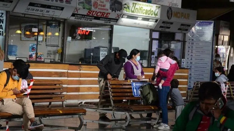 En la Terminal Bimodal de Santa Cruz, padres de familia hicieron fila por varias horas para poder obtener el permiso de viaje para sus hijos, muchos de ellos criticaron la falta de organización por parte de la Defensoría.