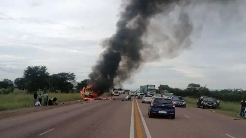 "El minibús se incendió y 16 de sus ocupantes, atrapados, murieron quemados. El conductor del otro vehículo también falleció instantáneamente", con lo cual el balance total del accidente es de 17 muertos, informó el portavoz del departamento regional de Transporte, Mike Maringa.