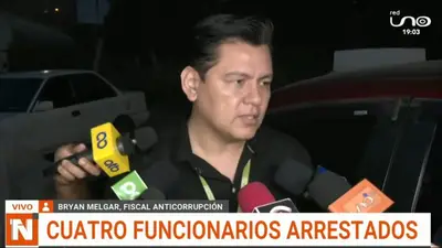 El fiscal Melgar informó que cuatro funcionarios fueron arrestados y remitidos a la Dirección de Lucha Contra la Corrupción (DELCC) en continuidad al registro del lugar iniciado el día anterior.
