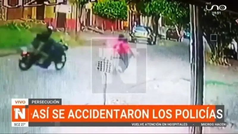En las imágenes se puede ver que mientras los uniformados perseguían a dos personas en una moto, se resbalan al doblar en una curva cerrada y caen del motorizado de dos ruedas.