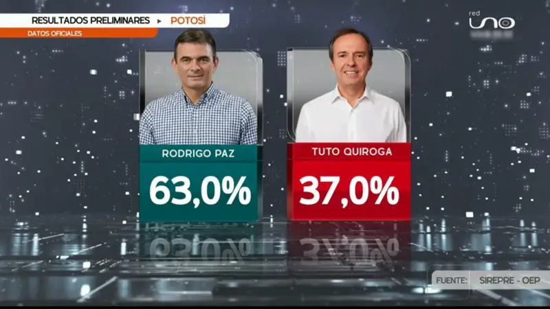 Los primeros resultados preliminares de la segunda vuelta de las elecciones presidenciales en el departamento de Potosí, según datos del Sirepre, confirman la ventaja para el candidato Rodrigo Paz, del Partido Demócrata Cristiano (PDC).