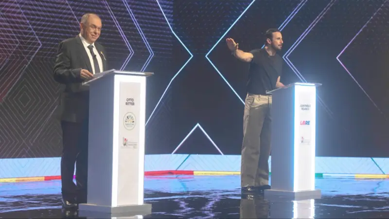 En los espacios de pausa del debate electoral, Otto Ritter y Juan Pablo Velasco protagonizaron un intercambio de declaraciones cruzadas, con asesorías constantes y evaluaciones en vivo desde el backstage.