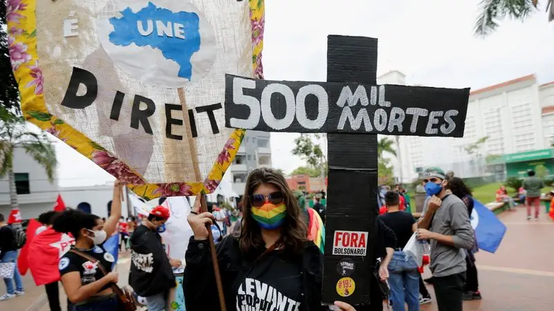 Los manifestantes denunciaron que los 500.000 muertos son una forma de genocidio realizado por el gobierno contra el pueblo brasileño, sosteniendo letreros que exigían la destitución de Bolsonaro mientras cantaban y tocaban tambores.