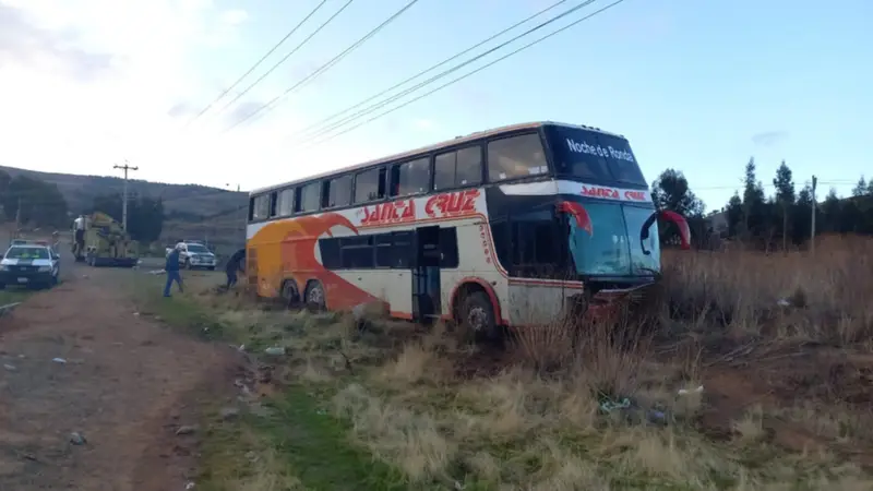 El bus de la empresa "Expres Santa Cruz" chocó contra un promontorio dejando siete personas heridas, por el violento impacto. El parabrisas, parachoques y el lugar donde se encuentra el copiloto se encuentra totalmente destrozado, en la zona se encuentra personal de la Policía.
