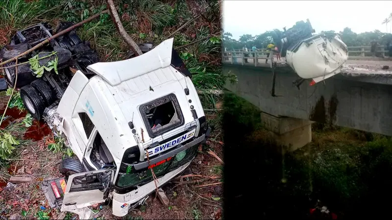 El conductor del vehículo de alto tonelaje perdió el control, chocó contra las barandas y terminó volcado. La cabina quedó debajo del puente.