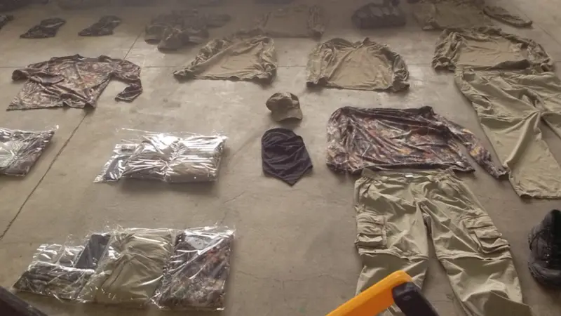 Entre los elementos secuestrados destacan uniformes de tipo militar color beige, que eran utilizados por el grupo encargado de custodiar un hangar y los vuelos vinculados a la red.