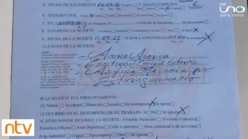El Certificado de Defunción de Yhurayma C.C. reveló que la niña murió por asfixia mecánica por estrangulación, este tipo de asfixia se produce por la constricción del cuello. El documento también señala que la niña sufrió una anoxia anóxica, además de una construcción cervical externa. Se estableció como hora de muerte, aproximadamente, las 00:00 del 11 de abril.