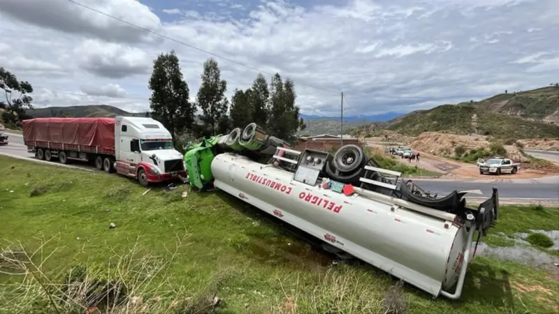 Un violento accidente de tránsito se registró este sábado en el kilómetro 58 de la carretera que conecta Cochabamba con Oruro. Un camión cisterna que transportaba aceite vegetal colisionó de manera frontal contra un tractocamión, provocando que el vehículo de alto tonelaje terminara volcado a un costado de la vía.