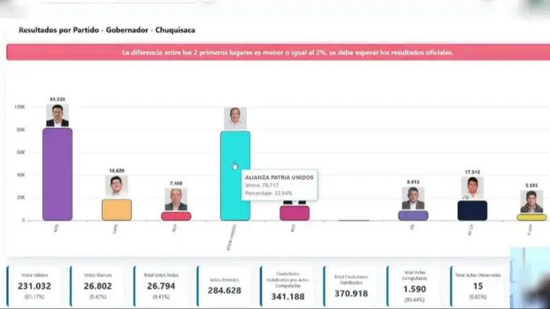 Los resultados preliminares al 90% del Tribunal Supremo Electoral (TSE) tras la jornada de votación de este domingo posicionan a Luis Ayllon con un sólido 35,1% de los votos válidos. Esta tendencia lo señala como el virtual ganador de la Gobernación de Chuquisaca, consolidando una ventaja que sus seguidores ya celebran en las principales plazas de la capital.