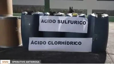 Además de las detenciones, el Ministerio Público informó el secuestro de ocho vehículos (cinco camiones, una vagoneta, un minibús y una camioneta) y el hallazgo de 190 turriles que contenían una cantidad masiva de insumos químicos para la elaboración de cocaína: