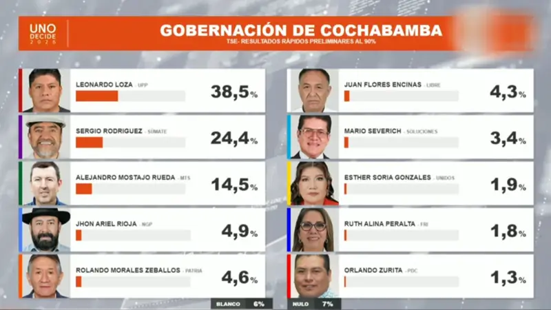 Dato Clave: Si ninguno de los candidatos a la Gobernación logra superar el 50% de los votos válidos, o el 40% con una diferencia de 10 puntos sobre el segundo, Cochabamba se encamina a una segunda vuelta electoral programada para el próximo mes.