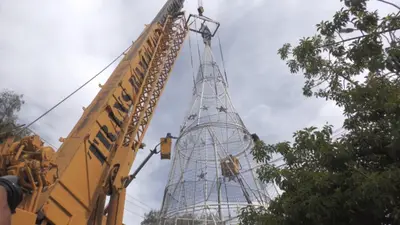 El jefe de Alumbrado Público, Gerson Merubia, detalló que un equipo de 10 funcionarios, maquinaria pesada y personal de Obras Públicas trabaja en los últimos retoques del árbol monumental.