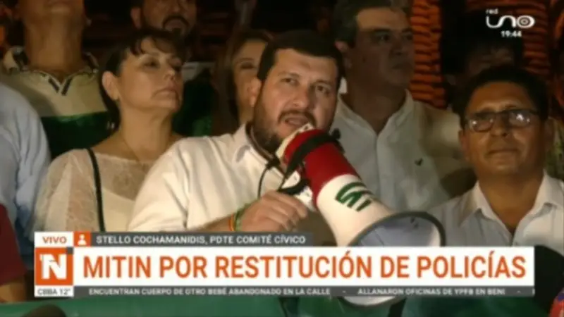 El presidente del Comité Pro Santa Cruz, Stello Cochamanidis, expresó su respaldo al pedido de restitución de más de 100 policías destituidos de la institución, en un mitín realizado este miércoles.