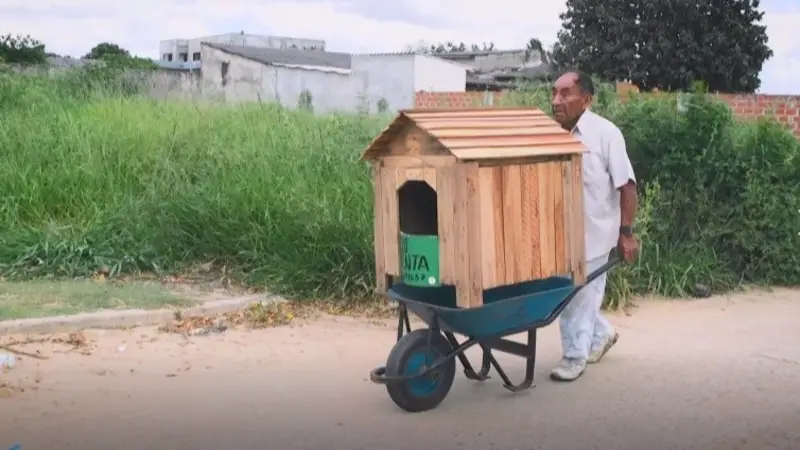 Don con Jaime Barral, un hombre de 78 años, que se dedica a la construcción de casas para perros, con madera de pino reciclado. Este emprendedor, todos los días sale a vender las casas en una carretilla, que tiene que arrastrar durante largas horas, sin embargo, por su edad y su diabetes, a veces no puede lograrlo, es por eso que pide ayuda a las personas de buen corazón para que puedan donarle un ‘motochata’, para continuar trabajando y llevar el sustento a su familia.