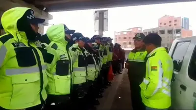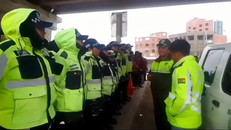 Guardias municipales y policías controlan que se respeten las nuevas tarifas de transporte en El Alto.