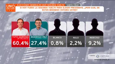 La preferencia de intención de voto en el departamento cruceño rumbo a la segunda vuelta es muy amplia en favor del candidato de Alianza Libre: Jorge Tuto Quiroga tiene un 60,4% de intención de voto, mientras que Rodrigo Paz tiene un 27,4%. Es decir, la diferencia es más del doble, y en puntos porcentuales es de 33%.