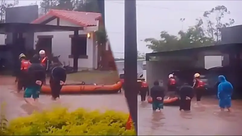 Uno de los casos más dramáticos ocurrió dentro de un condominio, donde una mujer y su bebé de pocos meses tuvieron que ser evacuadas en un bote inflable debido al alto nivel del agua.