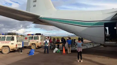 Según Defensa, la Fuerza Aérea Boliviana (FAB) dispuso "el despliegue de un avión Hércules para realizar el vuelo solidario" debido a las difíciles condiciones de acceso por tierra en la zona, a pedido del alcalde de Apolo, Rully Jiménez.