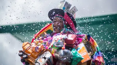 Pese a que iban cargados con distintos bienes, como víveres, billetes y vehículos en miniatura, entre otros, los participantes mostraron su entusiasmo al desfilar y bailar en una pasarela.
