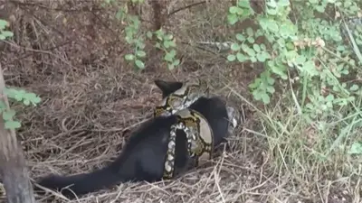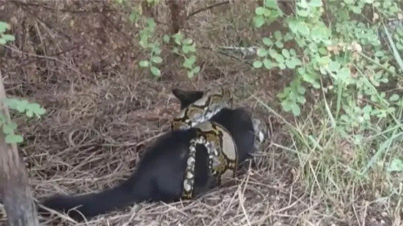 En las imágenes se ve que Porsche, de cuatro años, y la pitón, la serpiente ya está culminando su ataque cuando los hombres deciden intervenir con un palo y empiezan a pinchar al reptil para que se aleje, poco a poco la serpiente se va desenroscando y, finalmente, deja libre al gato, este, sin embargo, se ve muy afectado, casi que agoniza.