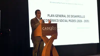 El ministro de Planificación del Desarrollo, Fernando Romero, presentó este miércoles el Plan de Desarrollo Económico y Social (PDES) durante el Encuentro Nacional de Exportadores, donde expuso los siete ejes estratégicos que articulan la propuesta gubernamental y que proyectan al país hacia un horizonte de 100 años de transformación, con miras al tricentenario.