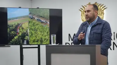 El ministro de Gobierno, Roberto Ríos, brindó un informe sobre los hechos acontecidos en esta jornada tras la toma del predio Patujú, en Montero, realizada por presuntos avasalladores que retuvieron ilegalmente a varias personas.