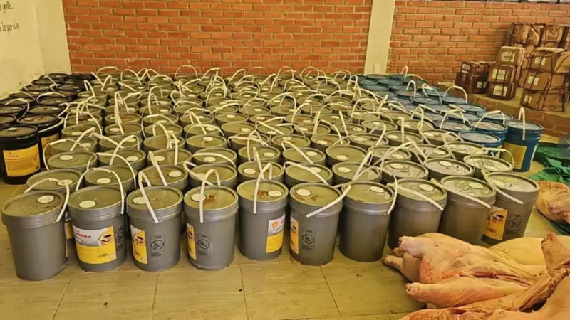 En una de las embarcaciones se hallaron 3.200 litros de aceite automotriz, equivalentes a 160 baldes, además de aditivos y líquidos para mantenimiento vehicular.