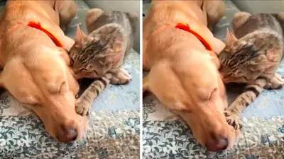Como se aprecia en las imágenes, el felino se echó al costado del can y puso una de sus patas delanteras cerca de su hocico. Después, lo movió de forma lenta para darle unos cariñosos mimos con sus garras.