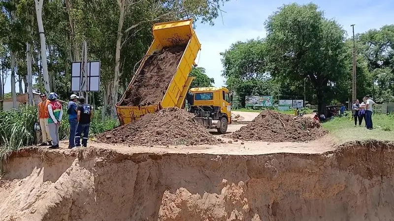 En el lugar, una volqueta deposita grandes volúmenes de arena para rellenar las zonas socavadas, mientras se espera que maquinaria pesada complete las tareas en las próximas horas, con el objetivo de restablecer el paso vehicular y peatonal.