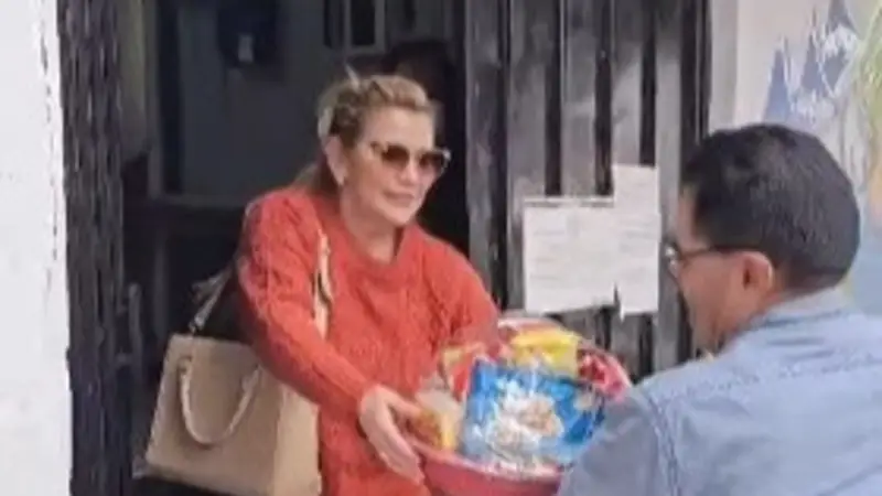Añez ingresó al penal de Miraflores portando un canastón con varios productos.