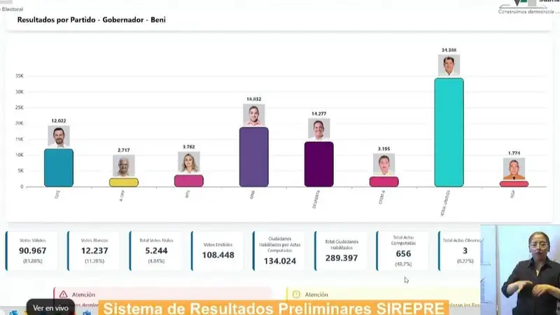 Con el 48% de actas computadas, el Tribunal Supremo Electoral (TSE) informó, que el candidato Jesús Eguez lidera la elección a la Gobernación del Beni con el 37,23% de los votos, según datos preliminares difundidos la noche de este domingo 22 de marzo.