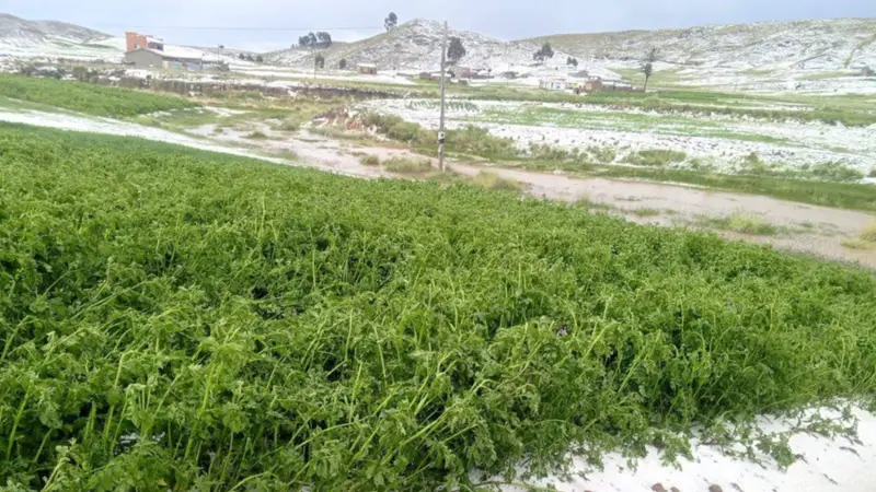 Una intensa granizada registrada la tarde del domingo afectó a pobladores del municipio de Huarina, en la provincia Omasuyos del departamento de La Paz, provocando daños en la producción agrícola y la muerte de animales.