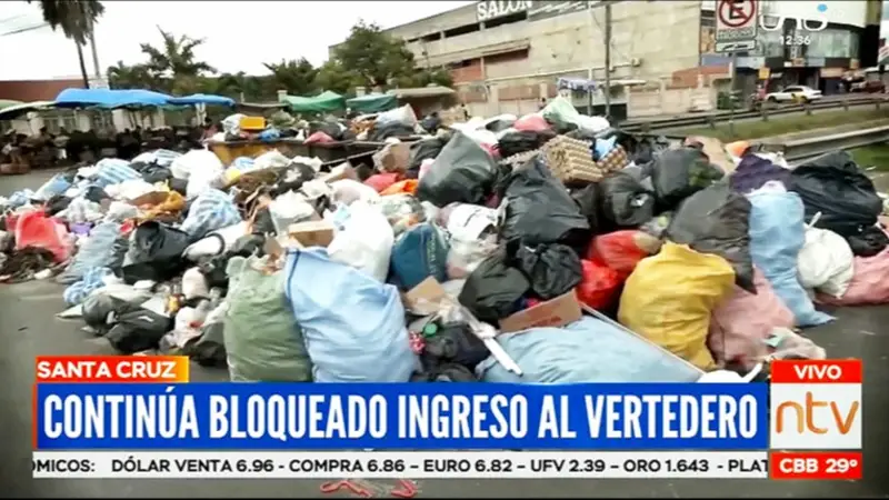 Más de 3.000 toneladas de residuos se acumulan en las calles de la capital cruceña debido a los bloqueos en el acceso al botadero de basura protagonizados por vecinos del Distrito 14.