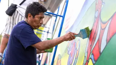 De Bolivia a Estados Unidos, el arte, color y cultura del "poder de los andes" se refleja en el primer mural boliviano en Filadelfia, creado por el reconocido artista Mamani Mamani.