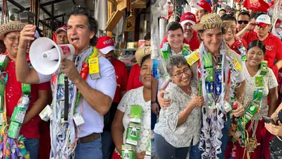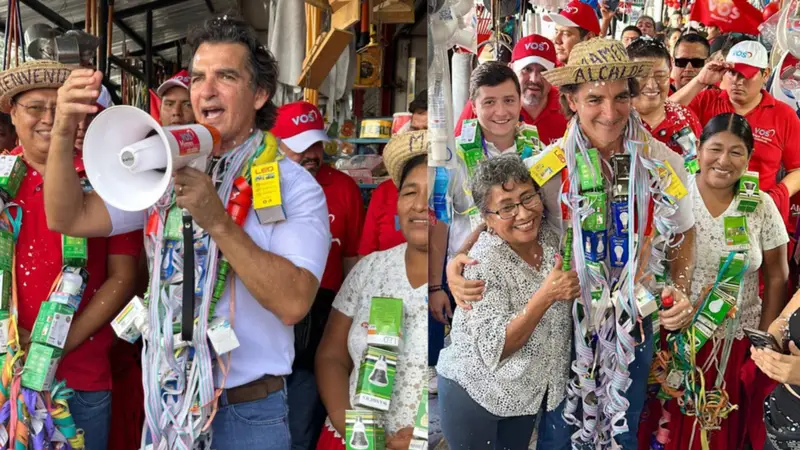 Durante el recorrido, el aspirante compartió con distintos puestos de venta acompañado por los candidatos al Concejo Municipal Reina Condarco, Edgar Álvarez y Marco Cadena.