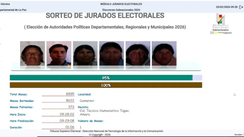 El Tribunal Supremo Electoral (TSE) llevó adelante este viernes el sorteo oficial de jurados electorales para el departamento de La Paz, en un proceso público y automatizado que designó a 53.970 ciudadanos como autoridades de mesa para las próximas elecciones subnacionales, que se desarrollarán el 22 de marzo.
