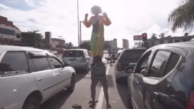 El payasito ‘Plin Plin’, con mucha habilidad hace peripecias con una pelotita, mientras sus hermanos ‘El Capitán América’ y payasito ‘Sonrisas’ realizan acrobacias mientras la luz del semáforo da en rojo.