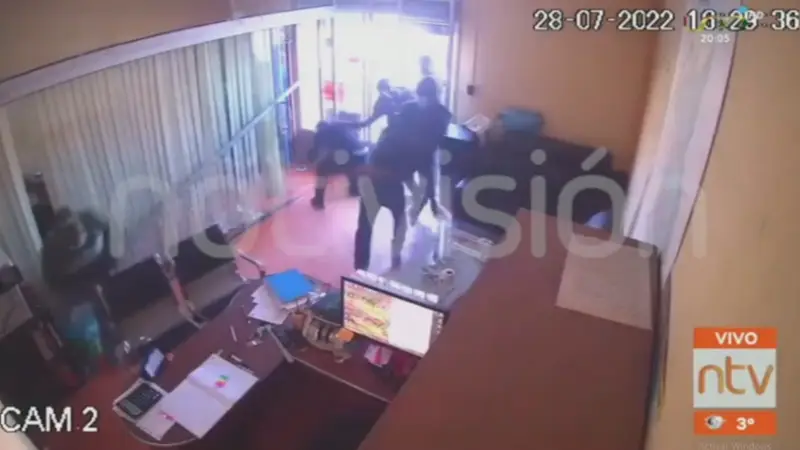 Se puede observar en las imágenes que los cuatro antisociales ya adentro del lugar, amenazan a los empleados para que guarden silencio, uno de ellos saca su arma de fuego y tras una pelea entre víctimas y delincuentes, estos logran llevarse la mochila con los 30.000 dólares, pero antes le disparan a una de las víctimas en la pierna derecha.