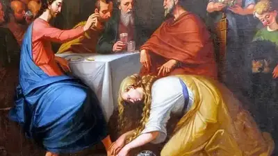 María, hermana de Lázaro, unge los pies de Jesús con un perfume costoso, en un gesto de amor profundo que simboliza la preparación para su sepultura.