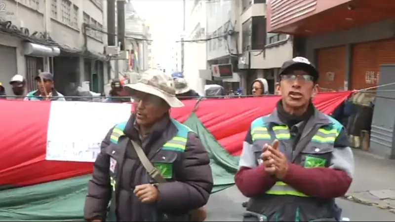 Trabajadores de Emaverde cumplen su segundo día de movilizaciones en el centro de la ciudad de La Paz, donde instalaron un bloqueo en inmediaciones de la calle Mercado y Socabaya, exigiendo el pago de salarios y beneficios laborales adeudados.