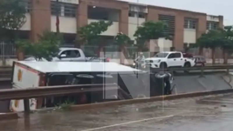 Este domingo, en horas de la mañana, un camión cayó al canal de drenaje ubicado en la avenida Tres Pasos al Frente del Séptimo Anillo, generando alarma entre los vecinos de la zona.