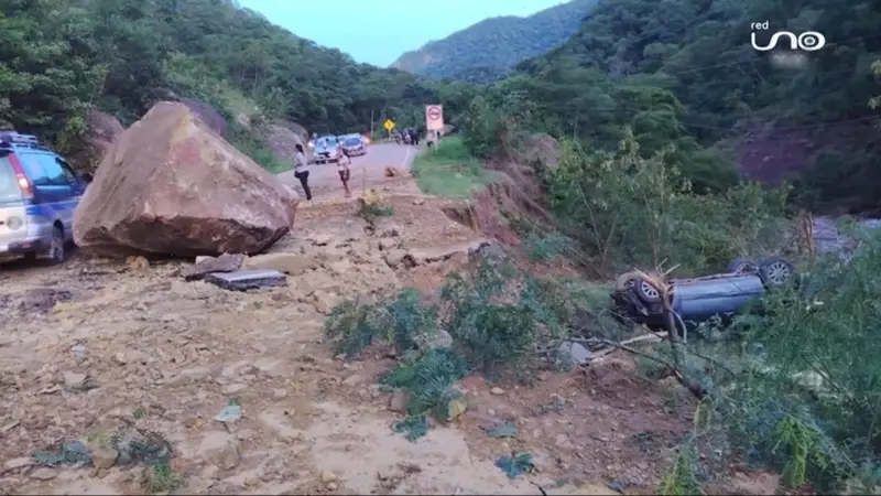 El desprendimiento ocurrió en la zona de Bermejo, desplazando al motorizado hasta el borde de la carretera. Autoridades piden suspender los viajes nocturnos debido a la inestabilidad del terreno por los derrumbes.