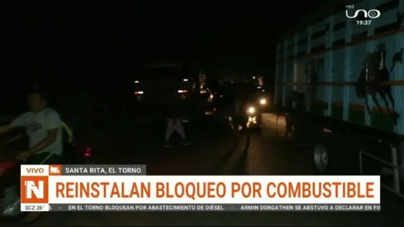 Transportistas del municipio de El Torno reinstalaron anoche el bloqueo a la altura de Santa Rita, en la ruta que conecta con los Valles Cruceños, exigiendo la entrega del cupo de diésel asignado a la zona.