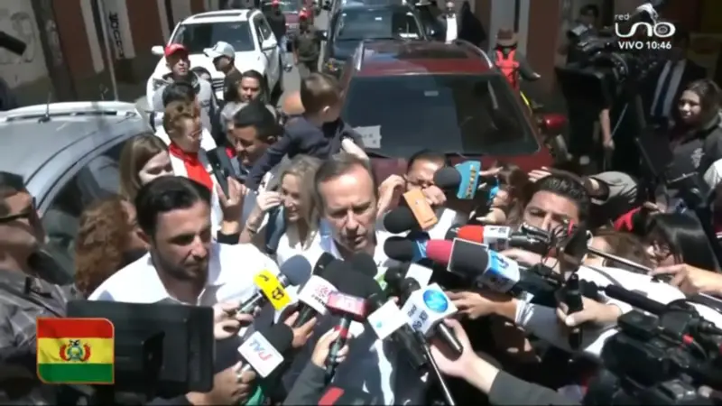 El candidato presidencial de Alianza Libre, Jorge Tuto Quiroga, arribó esta mañana al departamento de Cochabamba, donde fue recibido por simpatizantes y se dirigió a la Unidad Educativa Bolívar, lugar donde su padre ejercerá su voto.