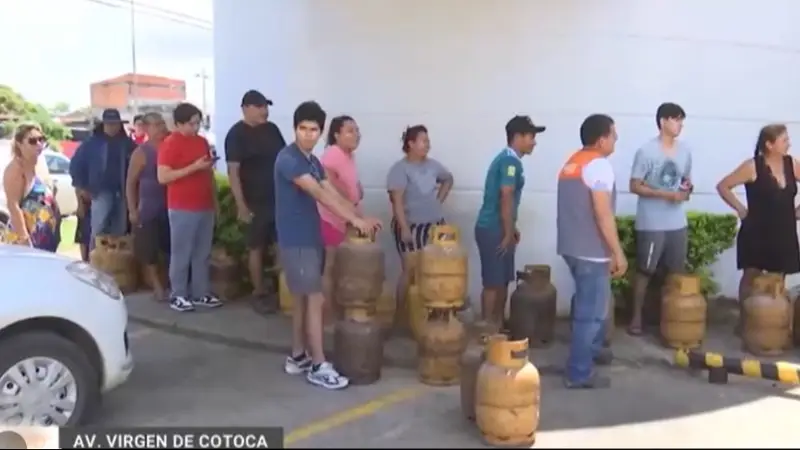 Vecinos de la zona este de la ciudad de Santa Cruz de la Sierra se concentran en la distribuidora de la avenida Virgen de Cotoca para conseguir gas domiciliario, ante el crítico desabastecimiento que afecta a varios barrios de la ciudad.