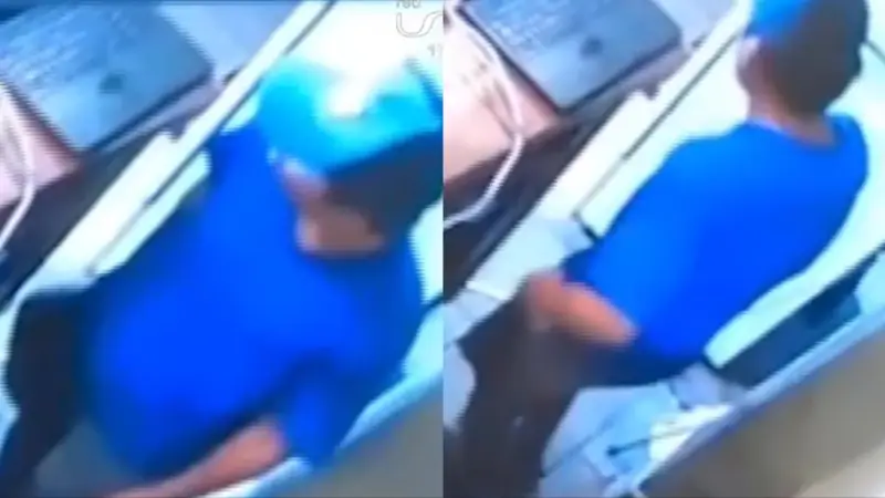 En las imágenes se observa al sujeto vistiendo una polera azul, gorra y short, ingresando al negocio con una bolsa en la mano. Aprovechando la ausencia de la encargada, se dirige directamente hacia la caja, toma el celular, lo guarda en el bolsillo y se retira caminando con total tranquilidad.