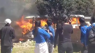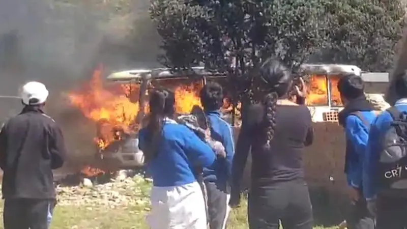 Estremecedoras imágenes muestran el momento en que un bus se incendió en la localidad de Lagunillas, norte de Potosí. Cinco estudiantes perdieron la vida calcinados y ocho, que también estaban en el bus, lograron escapar por la ventanas.