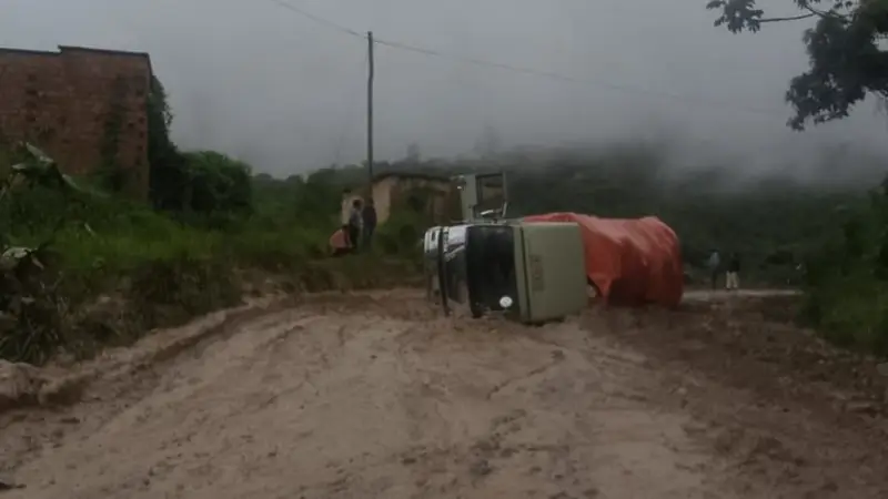 Un camión terminó volcado en una carretera del municipio de Chulumani, en el departamento de La Paz, luego de quedar atrapado en medio del lodo.