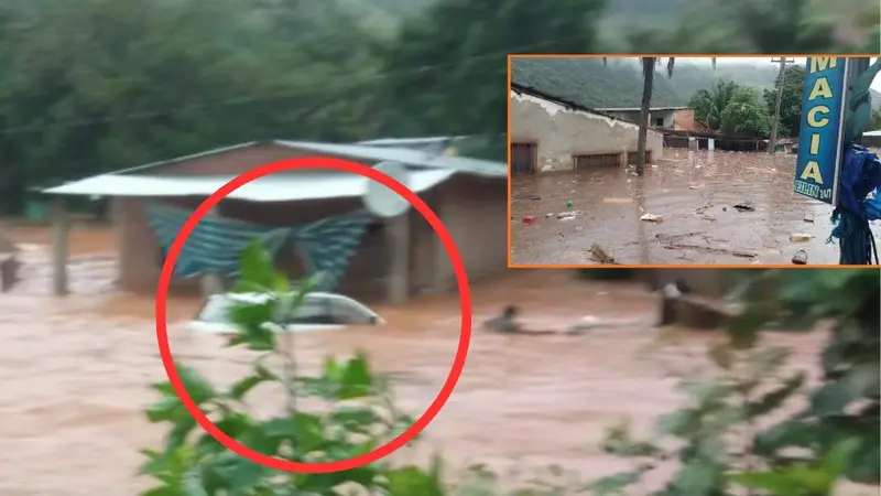 Vehículos particulares quedaron totalmente sumergidos por la corriente y bajo el agua. Se observan viviendas afectadas.