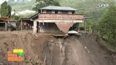 La mazamorra que descendió desde el cerro arrasó con parte de la estructura y dejó el terreno totalmente inestable. Las imágenes en el lugar muestran cómo la casa quedó suspendida al borde de una pendiente que continúa cediendo. Los ocupantes tuvieron que evacuar de inmediato ante el inminente riesgo de colapso.